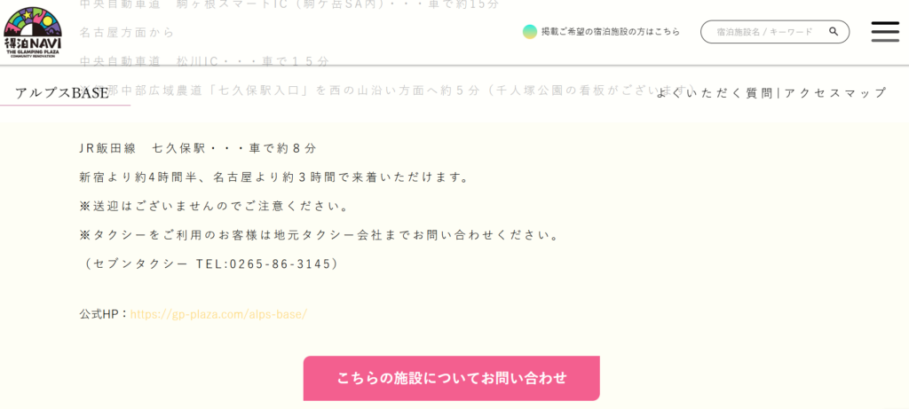 ①各施設の下部に「こちらの施設についてお問い合わせ」があるので、クリック